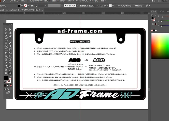 プリントフレーム用のテンプレートをダウンロード頂き、印刷範囲内でのデザインをお願い致します。 印刷範囲の大きい「スタンダードタイプ」、取り付け可能車種の範囲が広がる「スリムタイプ」からお選びください。 テンプレートは、Adobeイラストレーター、PDFでご用意しております。原稿の制作が困難な場合は、弊社でデザインを承る事も可能です。